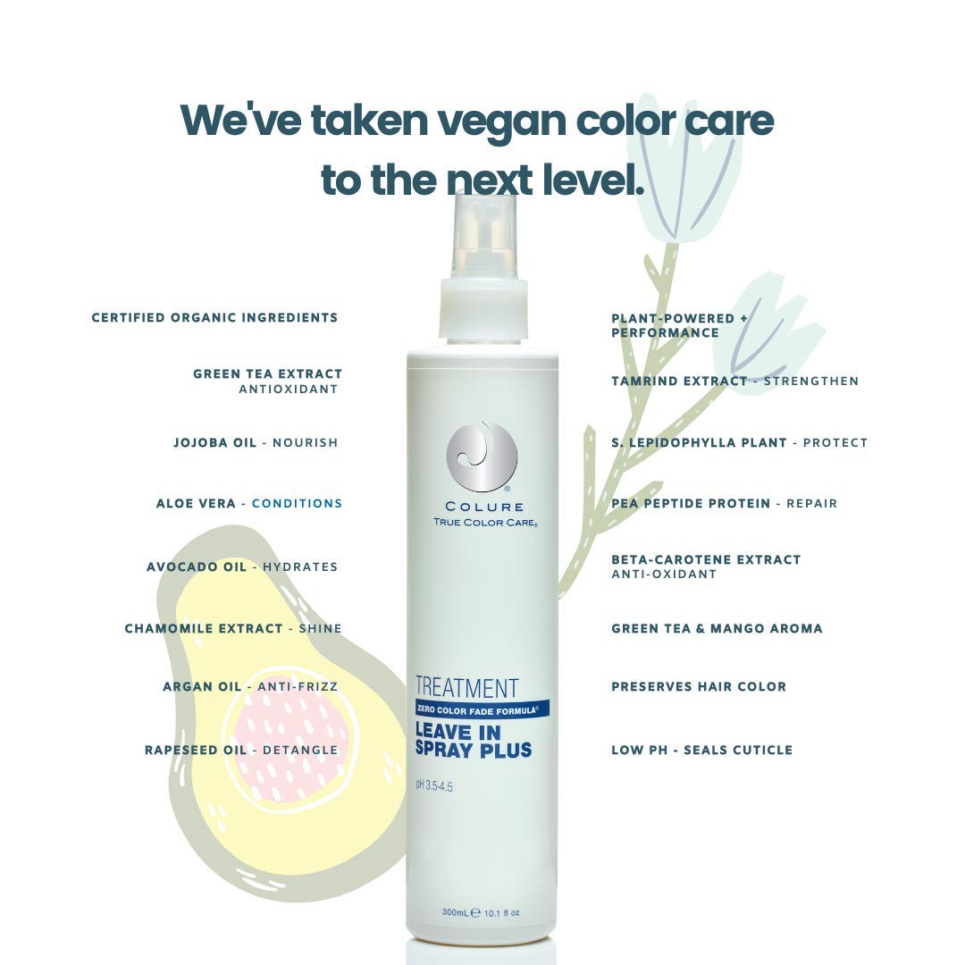 COLURE Leave-In Spray Plus Instantly Detangles, Repairs, Nourishes, and Locks-In Hair Color, all while protecting and keeping the hair tangle-free. This 100% vegan formula enriched with COLURE’s Organic Super Complex revives hair color vibrancy and youthful appearance.